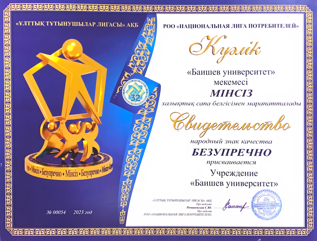 - РОО «Национальная лига потребителей» Баишев Университету выдано свидетельство «Народный знак качества «Безупречно» (№ 00054)